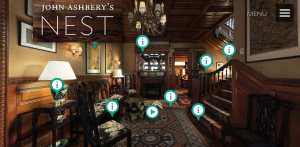 John Ashbery’s Nest was a scholarly website created at Yale University which surrounded John Ashbery’s successful career as a poet as well as his collections of housing furniture and art. Initially, I was greeted with an outside image of the infamous ‘Hudson House’ and then walked inside through a first person video. Following this, I was taken to a homepage which was the centre of all links. Within these links was an interactive virtual tour which narrated Ashbery’s life and provided incredible graphics of his house.