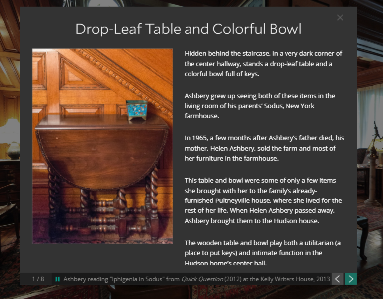 Each artifact contains a description of its meaning and continues into how it is connected to other aspects of Ashbery’s life. For example, this Drop-Leaf Table pictured below is found by the steps of the Center Hall. The description has been connected the table to eight slides of other historically relevant data, such as its placement in Ashbery’s childhood home and its meaning to his family as well. At the bottom of each object’s description is also either an interview or relevant poem from Ashbery that is somehow connected to the object. Through this additional information, metadata is interestingly created from initial information on the table.