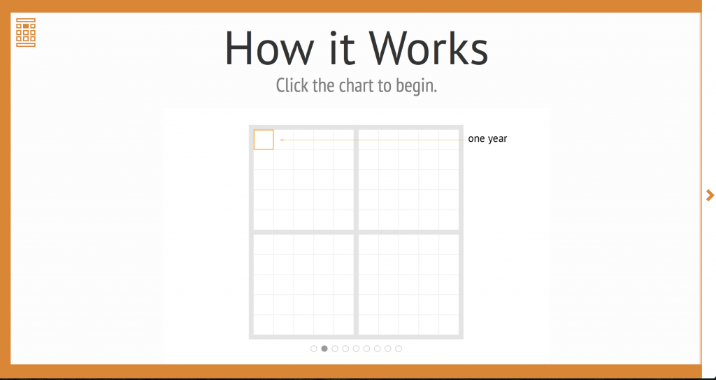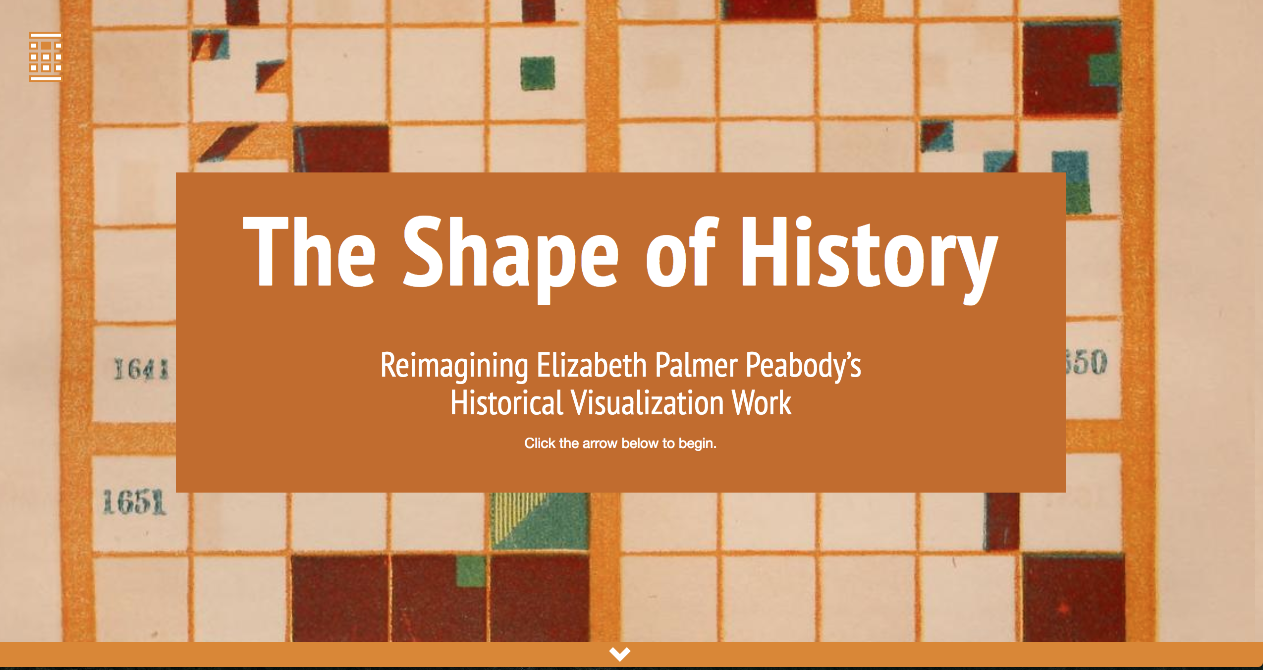 I chose to reverse engineer a digital humanities project called The Shape of History: Reimagining Elizabeth Palmer Peabody’s Historical Visualization Work. This project was created to visualize and make sense of data collected by Elizabeth Palmer Peabody and turned into grid chard to show the shape of history to the world. Her desire was to appeal to the mind’s eye so that people could understand history in a different way. This project placed events in different squares, creating a grid chart and each square contains different information about events and the countries where they occurred. It is very easy to navigate through the interactive project, and one of the squares gives you a small tutorial and “how it works”.The information and data were gathered from online databases, readings on Peabody and the data she gathered, and open source libraries like D3.js, jQuery, and two.js to provide this project with its sources. This project was created with HTML5, CSS, and Javascript. You can easily navigate through the project by scrolling, clicking on the arrows or simply clicking on the main map to the top-left side of the website and choosing the square you’d like to navigate to. It’s very interactive and some parts allow you to type out and create a box chart.