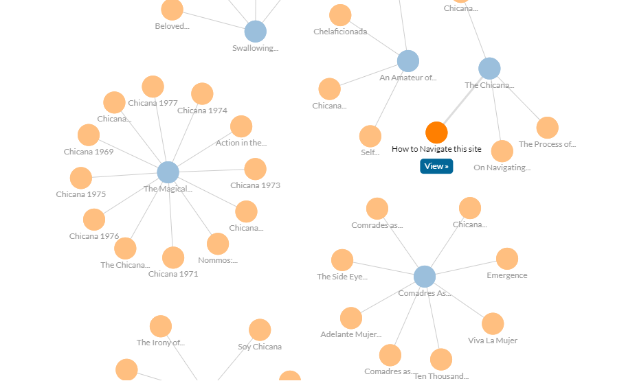 The processing part of this project follows the collection and digitization of materials, and I think it is most apparent in the network diagram on the “How to Navigate this Site” page. While each page addresses unique concepts, they are all related under the larger Chicana Diasporic narrative. While I’m not entirely sure of the technical process behind creating and visualizing such a network, I know that concepts had to be defined and categorized within a hierarchical organization of content–the blue dots and orange dots representing different organizational levels. Reflective pages discussing the process behind the project are sprinkled throughout the site, breaking down the challenges and reasoning behind it from Merchant’s point of view. The project takes on a dual narrative, as the processing and resulting narrative are discussed simultaneously. This value of transparency, often seen in DH projects, provides insight for users who may want to replicate and build upon the process for future projects.