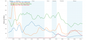 Individuals use an n-gram search in order to search and compare word usage in all of the texts in the database. For example, (as shown above) the words “lovely” and “sexy” have been used in 440k texts.