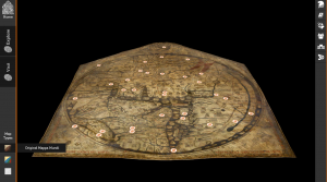 The Mappa Mundi is presented on a website through three different viewing: the Original Mappa Mundi, a Color Enhanced version, and a 3D scan version. It is also an interactive map that can be looked at in closer detail to see certain drawings and writing in closer detail the website choose to highlight. The website is split the map into a couple of different sub-subjects including myth and legends, bible stories, beasts of the world, strange people of the world, towns and cities, and 3D scan. This organization the information it to digestible tabs so aspects of the map are also explained by short description in greater detail.