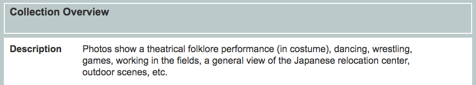 The Activities and entertainment at Heart Mountain Relocation Center Photographs, 1942-1943, is a collection of photographs depicting the activities of Japanese individuals in an internment camp in World War II. The entire collection is relatively small, with only 11 photographs. I was surprised by the size of the collection, as I had previously thought that collection with finding aides always consisted of tens or hundreds of items—I realize now that the research value of a collection does not depend on its size.