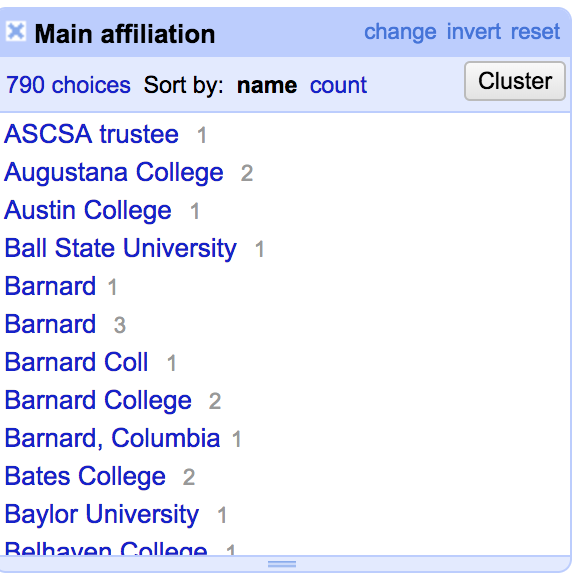 For example, for the main affiliation, we can see five different groups that are all the same Barnard College. To combine, I clicked on Cluster then edited the text to combine them together. Then kept going through the list to check if there are any other cases like this.