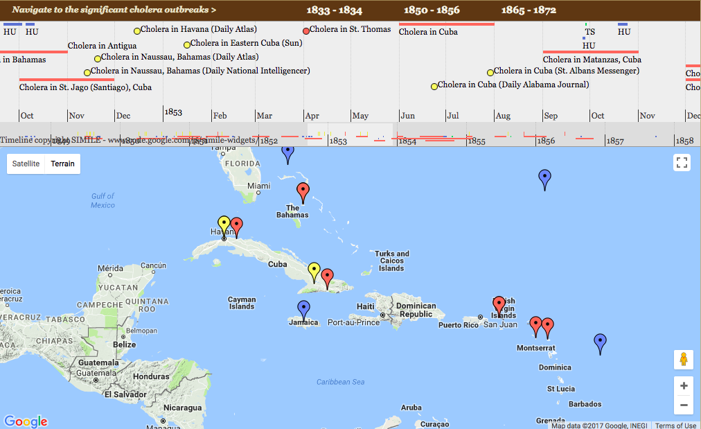 I chose to look deeper into the 19th-century Caribbean Cholera Detail Map. The map is focused on the Caribbean while it is the dates that one changes and we see the points on the map change in turn. There are four different colored points: Cholera Outbreaks, Hurricanes, Tropical Storms, and News Articles. We can assume through this that the cholera outbreaks are related to when and where the hurricanes and storms take place. We also then see where the news is to better understand when it was understood there was an outbreak. The assumption of the map is that there is only a correlation between storms and cholera. There are no other causes highlighted. There is also no info on any deaths. Alternatively, there could be a map that shows where deaths happened and how many for each region. Still using the function of browsing through dates, we can see either the increase or decrease in certain years of cholera-related deaths.