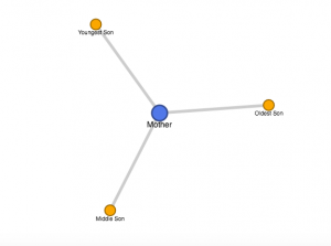 The story in its entirety only mentions 5 characters. The three sons, the mother and the father. The father was barely mentioned, and the relationship between the mother and the sons seemed pretty straight forward. In creating the diagram, I couldn’t find many ways to make an intricate design, as the relationships were pretty straight forward as to who knew who. The network graph can illuminate plenty of connections in stories and in datasets in general, however, I did notice a lot of limitations to the graph. It’s really cool to see the strengths of certain relationships as well as seeing who has the most connections, however it is impossible to display the evolution of certain characters’ relationships with each other. Based on events, or circumstances, relationships can change and the network diagram is really hard to adjust to fit these changes. You also truly can never say whose relationships to whom are stronger unless you actually know the relationship. Furthermore, if there is a large dataset, I don’t know if this would be the most efficient way to manage and understand relationships.