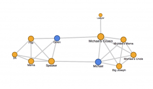 For my blog post this week I picked Given by Jesmyn Ward. Given is a story about a black football player who was killed by a white boy while hunting. While reading it, I had a hard time keeping up with who was who’s uncle versus dad versus the sheriff and so on. Therefore, it ended up being the perfect story for a network graph as it laid out clearly everyone’s connection to one another.