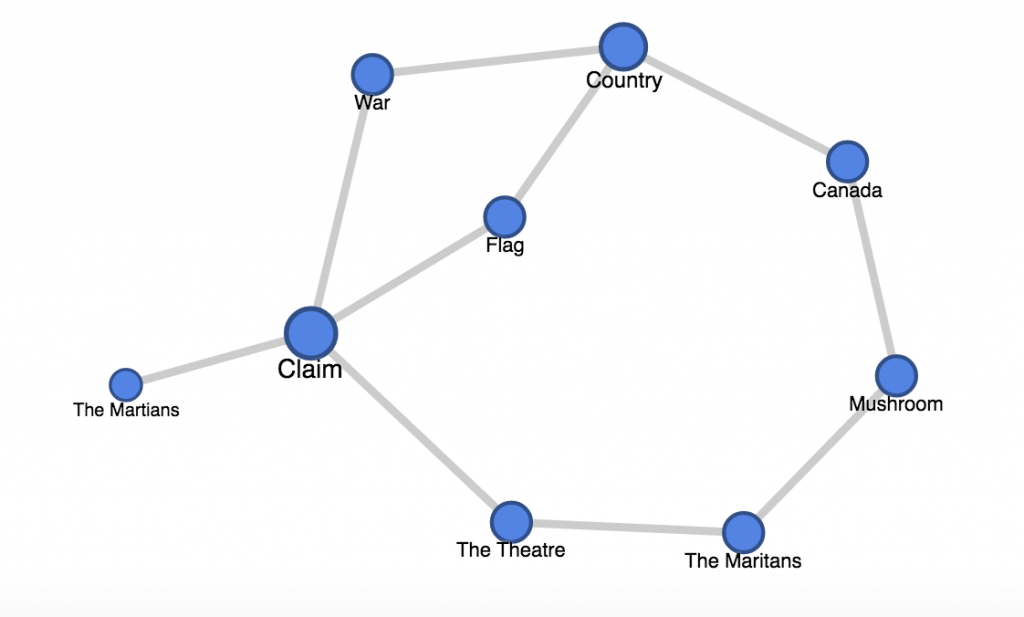 As seen in the plot (which can be played with here), the story can be examined through the use of these nodes and references. We see that the Martians and Mushroom first start talking, and then we see their first main strands of conversation. The Martians want to get to the Theatre, and the Mushroom slowly starts talking about how the Theater is formed. They are in Canada, which is a Country, with its own flags and wars that are used to claim the land that is sits upon. The Theatre is often a retelling about how those claims are made.