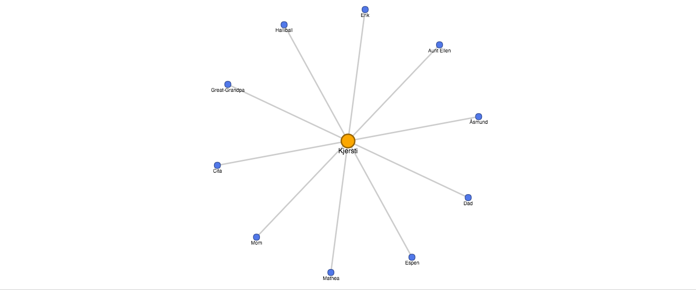 However, this network graph has its limitations. For example, I wish that I could have highlighted Kjersti’s stronger connections, such as her mother, who she interacts with and mentions the most. Some of her other connections are more mysterious and hard to tell how close she feels toward them. Because it is a short story, it is difficult to build an effective network graph with all of the important details, such as how the traumatizing accident happened, why Kjersti is so sad and anxious, or how her great-grandfather passed away. The network graph introduces all of the characters to pay attention to throughout the story because they are connected to the main character in different ways, but it does not paint the whole picture or tell the same story due to the lack of words.