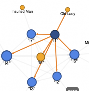 My graph illustrates the network of Seven People With The Same Name and Their Discrete Moments. The story is composed of seven short stories, each of them describes a self-reflexive moment the protagonist is undergoing, or an experience that triggers them to reflect themselves. The graph illustrates two connections: the inter-connected connection between the seven people with the same name and their connection with influential people in their lives. Being influential means the side characters have contributed to the plot development. Since the author only provides the name of one side character in the story, the graph uses “I1” to “I7” to represent the protagonist “I,” and uses different ways, such as occupation, to represent other side characters.