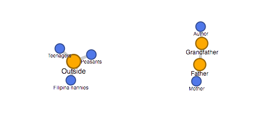 These nodes were connected through the familial bond between the characters. For example, the mother, family, grandfather, and narrator are all in one cluster because they are, by definition, family. On the other hand, secondary characters, such as the teenagers and peasants, are connected together on a separate cluster, as they supplement the story, rather than add to the dynamic of the narrator’s grandfather.