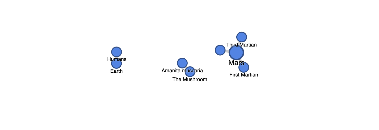 This graph shows how theres a connection between the three Martians, but no connection between the Martians and the humans or the mushroom. The limitation of it is that it only shows one kind of connection.