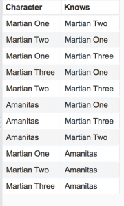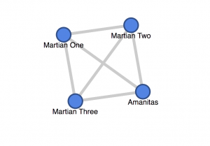 In the short story, The Martians Claim Canada by Margaret Atwood (the author behind the acclaimed novels Alias Grace and The Handmaid’s Tale), there are only four central characters: three martians who get lost in Canada on the way to see a musical in New York, and a talking mushroom that helps them along the way. Since there are only these four characters and no scene changes, I decided to make my network be the interactions between characters, which resulted in a square like shape since all the characters spoke to each other. This illuminates that all the characters do know each other. Ideally I would have liked to have separate edges to denote different conversations and responses, but I was not able to do so.