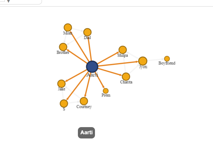 With the Google fusions network graph we are able to see the connections that the characters have. Aarti is at the middle, she is the single cohesive node that acts as the center of the entire network. In this we can see where the different groups of characters form different groups for Aarti to come into. One being her family, an another is the group of girls that made the virginity pact with her, and the last being the people that have influenced her college and sexual experience including both Courtney and S, the boy she has sex with. In the network graph we can which way the relationships move. The graph shows that many of the relationships are moving outward indicating these are direct connections of the people that Aarti has become familiar with. In addition, the lines that are not highlighted indicated that these are relationships that Aarti si not apart of or that Aarti has no real significant relationship with this character. That is the case for Aarti and Jyoti’s Boyfriend who is not a physical character in the story. The limitations of this method is that there does not seem to be a way to indicate the severity of a relationship, such as that Aarti and Courtney have a stronger relationship that Aarti has with Jake. Also, there is no way to show the amount of interactions that characters have with one another without reading the labels associated with each tie.