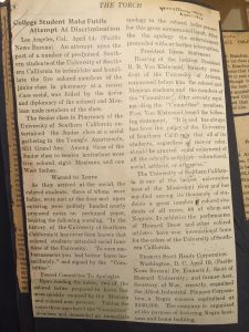 Spending time in the Special Collections library gave me awesome insight into the world that Johnson was living in. Contrary to the Conn reading, there is an incredible amount of content in the form of objects that can be put on display from Johnson’s work. One piece that particularly stood out to me was a newspaper clipping from Los Angeles, 1923 (see attachment)