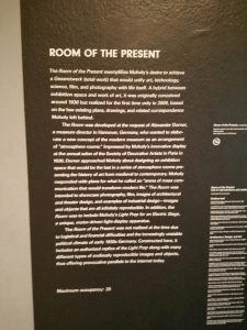 ed the Los Angeles County Museum of Art on Monday and I had hard time finding exhibits that applied a technology but I luckily came across this amazing exhibit called “Room of The Present”, a contemporary fabrication of exhibition space designed by Moholy-Nagy in 1930 which was not realized during his lifetime but recreated later in 2006. The room consists of small film booths, panoramic photography, and industrial design replicas. I personally loved the way things were installed because they were well-harmonized and balanced. Unfortunately, I wasn’t allowed to take photos or touch things, which was a shame because I did not feel like I was having a “real experience” of the room. While observing the exhibit, I overheard a museum guide giving detailed explanation of its background to the visitors, “His structure aimed to integrate isolated phenomena into a coherent whole, space creation is an interweaving of the parts of space, which are anchored in clearly traceable relations extending in all directions as a fluctuating play of forces.” Some visitors asked why the room was full of recreations rather than original pieces of Moholy. “Room of the present,” he spoke, “is an architectural embodiment of Moholy-Nagy’s reason for being. In his obituary, Bauhaus founder Walter Gropius remembered Moholy-Nagy as abundantly versatile and unbiased, always curious to find fresh point of view.”