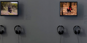 Essentially, it was just a simple set up with three ottomans in front of smaller TV screens. Each screen had a different video that explained backgrounds of Native America, specifically how it relates to the author and how the artist has been effected by his upbringing which eventually drove him to create his art and other works. The videos that i watch explain the cherokee culture and how they adapted to the presence of settlers, in addition to what the tribe is continuing today and how they have taken on the geopolitics of the modern days. The videos also touch upon the social movements of Native America, with a more specific focus on the American Indian Movement and how they have brought the tribe into the public eye again. Another video that I watched talked about how the author of the exhibit put himself into self-exile from the United States and his inspirations that he found in his travels. He goes into detail about what his life choices were and talks about his life work. It has a very human feel to it, different than just watching a video.