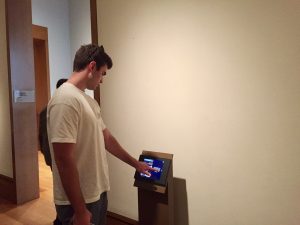 As far as the amount that visitors interacted with these different forms of technology, it varied for each form. For the television that required you to put on headphones to listen, there was little interaction from visitors. I figured that this may be because it takes the physical action of putting on the headphones to interact and some people may not want to take the extra step, or that the television was rather small so it did not catch many visitor’s eyes. In comparison, the television that was used for a piece of artwork gathered lots of attention. I believe this was because the screen was very large, it was placed right when you enter the exhibit, and the sound was on which also captured the audience’s attention. The third form of technology, the interactive type, gathered a fair amount of attention as well. I think that the interactivity as well as the transformation of learning information into a game form helped to lure the audience in to use the technology.