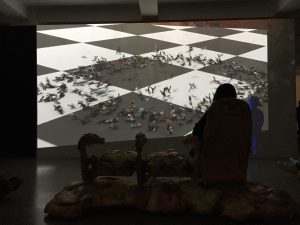 In the final piece, Transdimensional Serpent (2016), one gets to wear an Oculus Rift to experience a Virtual Reality art space. I waited with others in a line to get to try out the VR, something I don’t think I’ve ever had to do in a museum setting. But once it was my turn, I was fully immersed in the VR environment. The video itself depicted several different “transdimensional” environments, and turned the bench I was sitting on into a large white serpent eating its own tail. The video very playfully messed with my sense of space; in one instance figures approaching me grew to much larger proportions than expected. The use of VR technology in an art gallery created a new kind of intimacy, that at once built a space unto myself and took me out of the space I previously inhabited. While this was a particularly art-minded space, it led me to think about how VR would be used in another museum setting. I believe the technology does not lend itself to realistic spaces, but rather succeeds in placing someone in a surreal or absurd environment not previously possible.