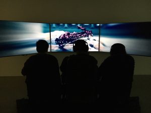 The gallery had three separate pieces, the first called Poor Magic (2016), is a video projection of different computer generated crowd simulations. The CGI characters run into walls and get swept up by pendulums, moving together with uncanny and rather silly mechanics. The whole experience is made even more uncomfortable as Rafman designed grotesque benches for viewers to sit on while watching the film. The chairs look as though they are made of strange, alien flesh – making the experience all the more alienating. By making these chairs, Rafman seems to replicate the sense of being a spectator in a movie theater, yet tweaks it, making this seemingly familiar act foreign. Another piece, Open Heart Warrior (2016) uses three video screens to surround the viewer with lush and graphic video game imagery. As this video seemed more traditional and static, I noticed less people taking the time to sit and view its full-length.