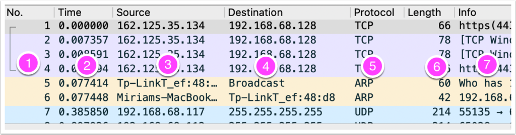 The number column (1) tells you which line you’re on in your list of packets. That also serves as a good way to identify which packet you’re talking about. The Time column (2) tells you how many seconds have elapsed since the capture started. Source (3) is the network address (IP address) from which the packet was generated. Destination (4) is the IP address to which the packet was sent. Protocol (5), of course, tells you which protocol was contained in the packet. Length (6) tells you how many characters the packet contains. And Info (7) gives you more information about the request.