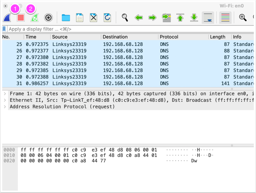 Then VERY QUICKLY click on the stop sign right next door to the shark fin. By default Wireshark’s captures are “promiscuous,” meaning they capture not only your own activity but the activity of every device on the same network as you.