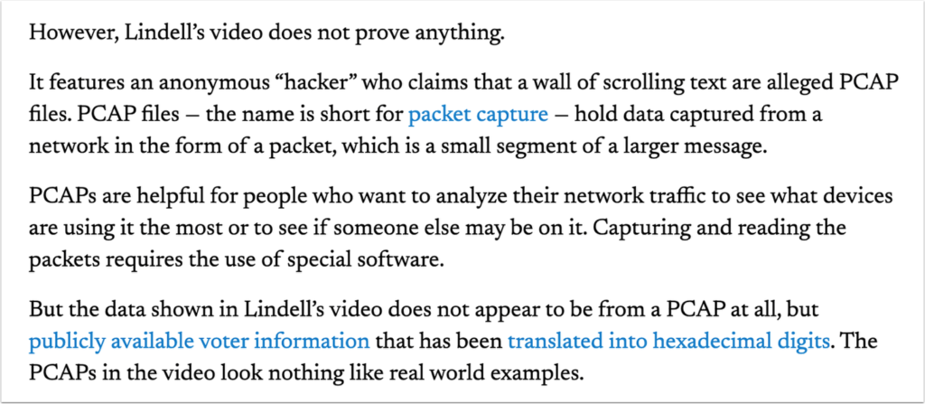 The picture below is an excerpt from a newspaper article about Republican attempts to prove that voter fraud took place over networks. You can see that PCAPs are the standard way network experts analyze network activity.
