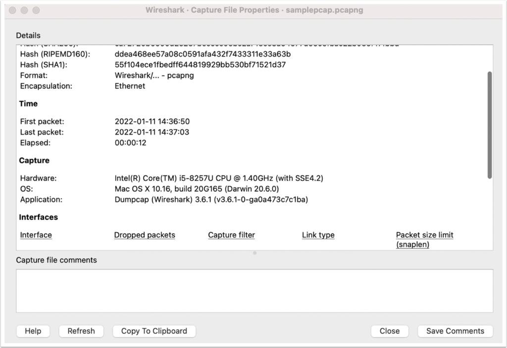There are so many lines here, it’s hard to tell what’s going on. Let’s try to get an overview of the entire capture. From the Statistics menu at the top of your screen, choose Capture File Properties. In the ensuing window, you can get some useful information about the PCAP: for example, it captures 12 seconds of activity and 1,961 packets. (You can also tell what kind of computer I have!)