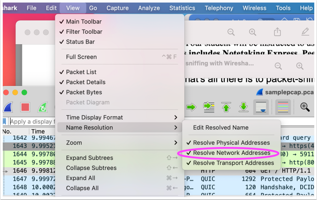 Delete the dns filter from the Display filter window by clicking on the tiny x at the far right of the search bar. You should now see all the packets again.It might make your work a little easier if you convert the IP addresses into human-readable names. From the View menu, choose Name resolution and check Resolve network addresses. Wireshark won’t be able to resolve every address (why not?) but it will make some IP addresses easier to read.