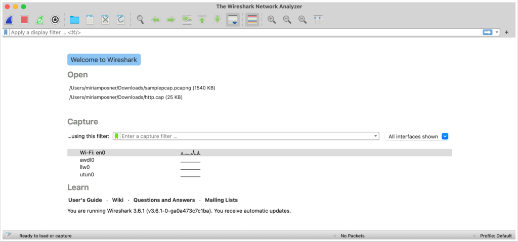 Double-click on Wireshark to open it. You’re greeted with a welcome screen.