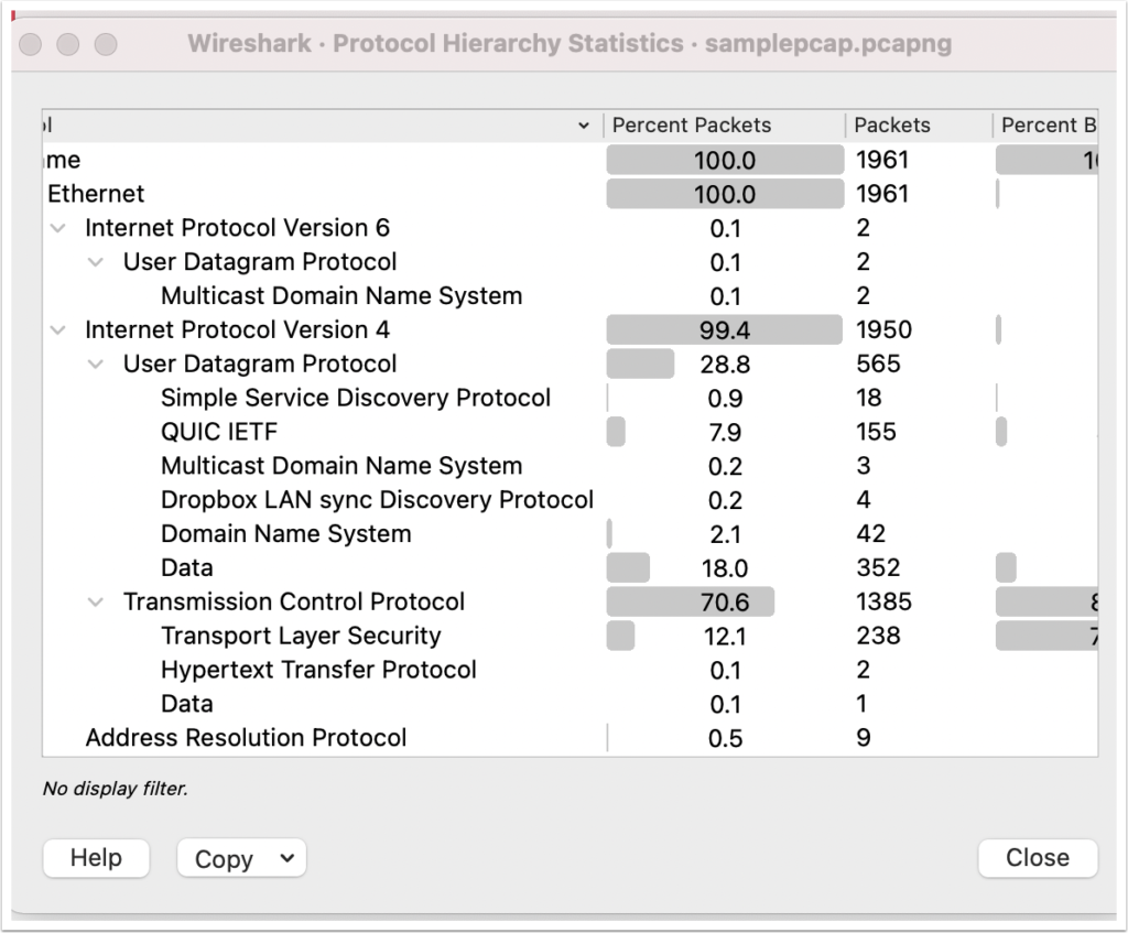 Let’s look at the percentage breakdown of the various protocols. From the Statistics menu, select Protocol Hierarchy. This tells you what percentage of packets contain each kind of protocol. Why do the numbers add up to more than 100%? That’s because each packet actually contains multiple protocols, even though Wireshark has divided them up in the main window so that you can focus on each protocol, one at a time.