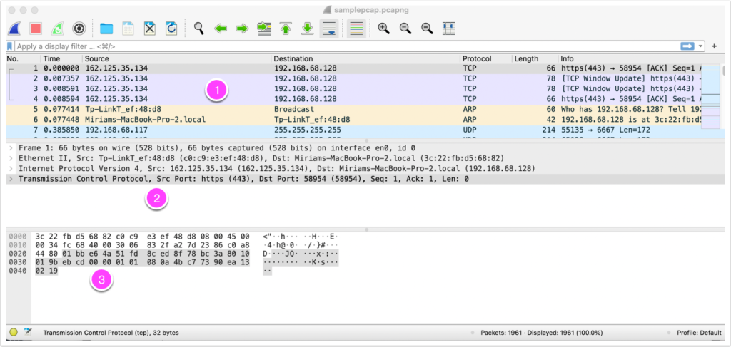 Wireshark’s interface consists of three main panes. The first, the main window, contains a list of all the network activity Wireshark observed during the capture period. (The colors of the highlighting on your version might be different from mine.) What are the color codes? The second, the middle window, gives you information about the highlighted line. The third, bottom window contains the actual message, in bytes. Usually it’s hard to read because it’s in hexadecimal and then ASCII code. You can minimize that bottom window, if you want.
