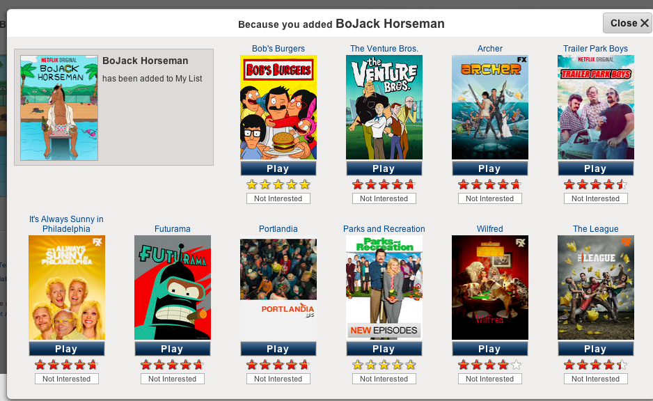 For this post I desperately wanted to get a screen shot, showing Bojack Horseman under a highly specified category with other similar shows. Of course, Murphy’s law hindered my search and the best I could get was without a specified classification. Thinking about Netflix after this article, makes me question when categorization gets too narrow. In the article, it is mentioned that often only a few films will exist in a highly specified classification. As humans seeking entertainment, do we want to stay exactly in the classification of the predessor or is the key to move a slightly different classification? (dark dramas about pigs as opposed to dark dramas about house pets for an obtuse example) Moreover, it brought up the question of what happens when the classifier (Netflix) produces its own content for the classification system? Can this be done without bias? Does bias of the information provider even matter? Does it jeopardize the efficiency of the system or does it make things easier to find? I guess in the case of Netflix, time will only tell.