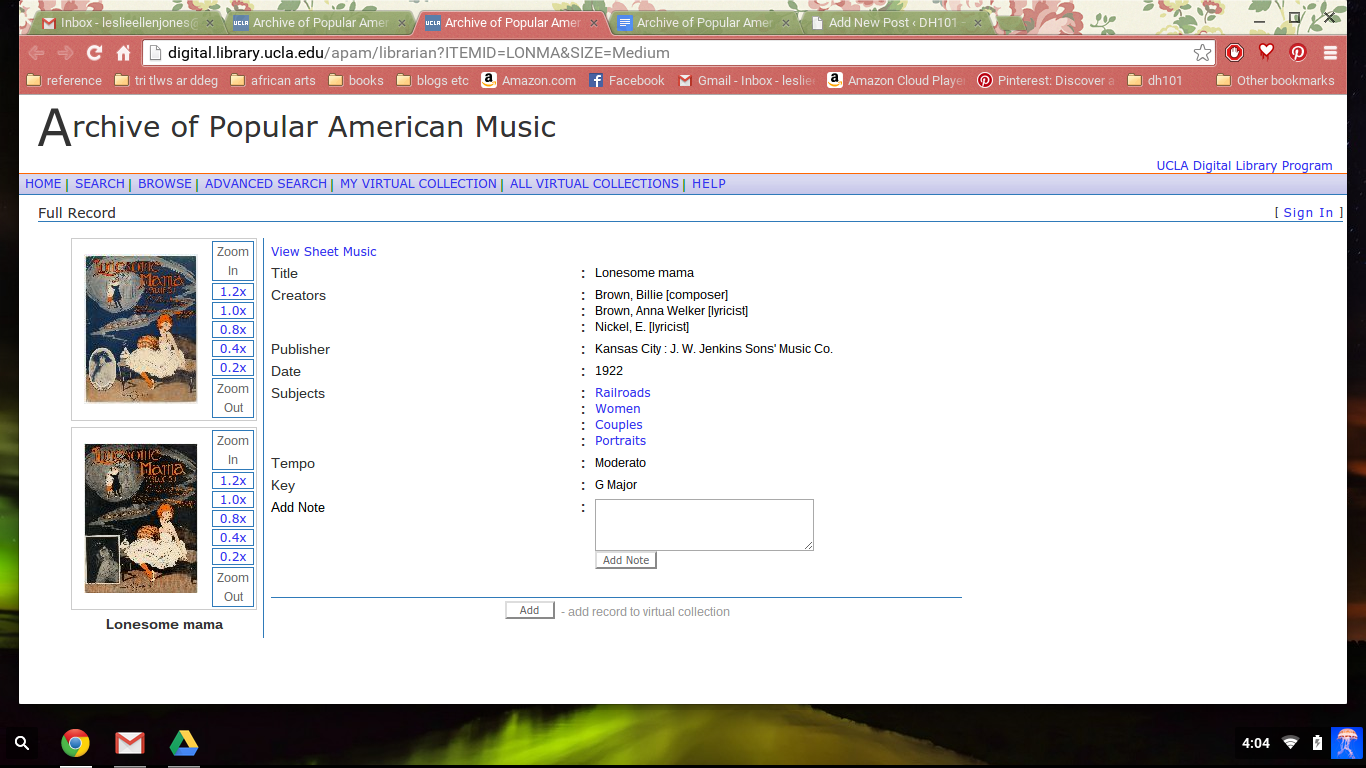 The digital archive offers both basic and advanced search options, as well as allowing you to browse by name (of the composer or lyricist), song title, cover art subject, and date. Search results come up as a series of thumbnails of the cover art, and when the thumbnail is clicked, the full record appears with metadata about the song (including the first lines of the song and of the chorus, the musical tempo and key, as well as alternate titles, in addition to the usual information about composer, lyricist, publication data, and date) and another thumbnail of the cover art, which can now be viewed at larger sizes. Where it’s available, you can also click on a link for the sheet music itself, which opens in a separate window as a pdf. Registered users can save records to a virtual collection and annotate for their own research purposes.