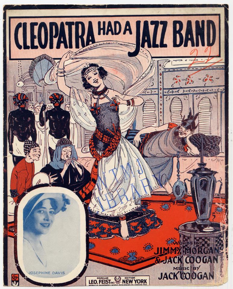A typical Orientalist representation of a Middle Eastern dancer: suspiciously white-skinned, wearing a quasi-Egyptian tunic that nonetheless reads like a stylish contemporary dress, and dancing to jazz–simultaneously African and American.