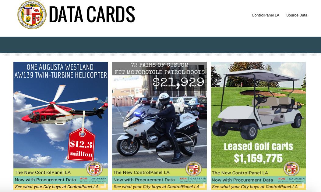 The dataset I chose to explore from the LA Controller’s Office was the What We Buy Data Cards.  The cards provide data for the 15 items that the city of Los Angeles spends the most money on.  These items are an AW139 helicopter, motorcycle patrol boots, golf carts, soccer balls, radar speed signs, basketball nets, ballots, thermoplastic paint, graffiti buster, TORO riding motors, Federal L.U.S.T. Tax, fire hoses, high visibility white traffic gloves, mops, and large frozen rats.  The data cards in this dataset constitute constitute individual records.  Each data card explains what the item is, how much they have spent on it, why they buy it, and a fun fact about the item. At the bottom of the card, there is a button that takes you to the control panel to explore the data even further. The spreadsheet provides specific data including the date the items have been purchased, how much it costs, the amount they bought, where they bought it and more.  This data can also be visualized in multiple ways such as pie charts, timelines, and bar graphs. Screen Shot 2015-10-18 at 11.17.42 PM