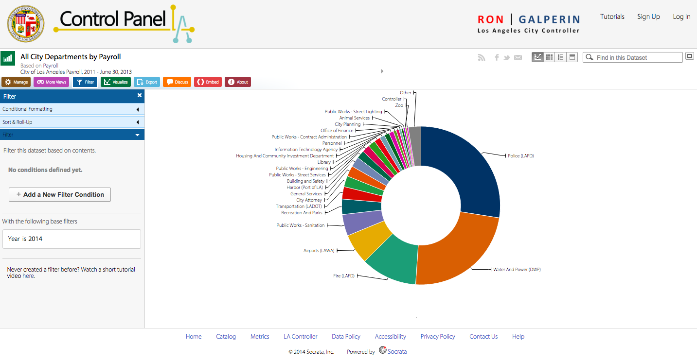 This database addresses how much tax payer money goes to specific city departments in Los Angeles. Essentially, this data is the number of dollars, from taxpayer paychecks, to the accounts of city departments. These number of dollars per department are separated and categorized, and then visualized online via a number of different mediums. Above we see the “donut” shape graph, but there are several more option available.