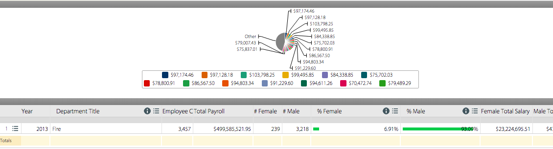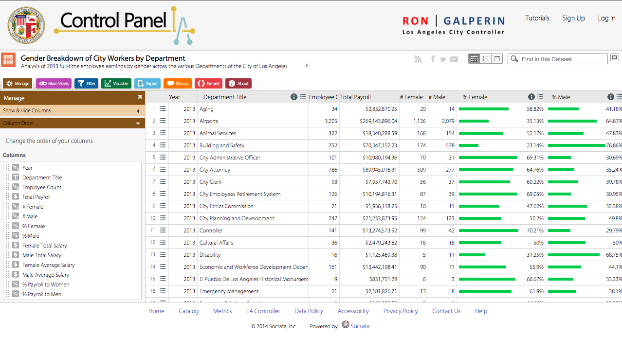 The Gender Breakdown of City Workers by Department is a dataset that has been released to the public from the L.A. Controller’s Office. More specifically, the dataset is an analysis of 2013 full-time employee earnings by gender across the various departments of the City of Los Angeles. Presented initially as a table, the site gives you other visualization options for the data, such as a bar chart, line chart, or pie chart.