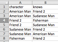 The nodes are the characters in the story. The edges connecting the nodes are who talked to who in the story. The network graph has limitations because it doesn’t represent the strength of the relationships between the characters. It doesn’t show who knows who better. For example, we do not know how long the American Man knew the Sudanese Man or how long the Sudanese Man knew his other friend. The network shows that the central node of the story is Friend 2 because he interacts with the most characters in the story even though the story didn’t mainly focus on him. Although, the graph does a good job at displaying which characters interacted with each other in this single situation.