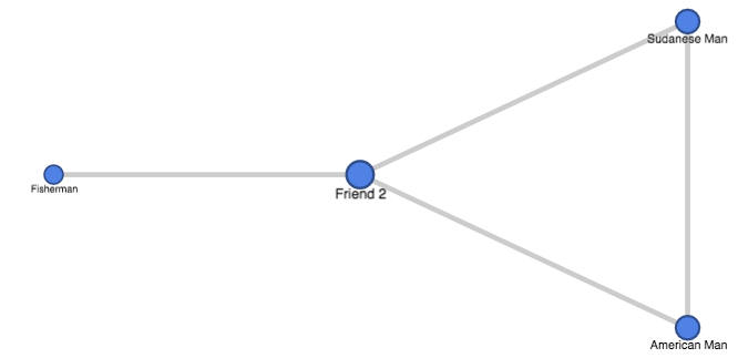 I chose to create a network graph for the characters in the short story “The Man at the River.” The story is about an American Man who bikes to a river in Sudan with his Sudanese friend. When they get to the river, the American man is afraid of getting an infection in the water so he decides not to cross. The Sudanese Man crosses the river where his other friend, Friend 2, tells him to have the American Man cross over the river. Friend 2 asks the Fisherman to help them by using his canoe to get the American Man across.
