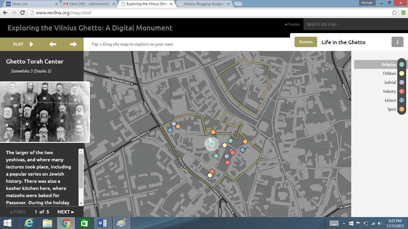 The project provides a clear picture of the ghetto (often times complemented by real pictures) without inundating the viewer with lengthy details. It successfully reveals snapshots of the lives of the residents, and successfully evokes empathy and emotion, whether it be anger, sadness, or inspiration. The numbers of deaths (“exterminations” during “purges”) in the ghetto system is especially sickening, and attaching specific dates, images, and locations to these events is very effective. Furthermore, in a book I recently read titled The Amazing Adventures of Kavalier and Clay (Michael Chabon), one setting is a European ghetto. Although the story takes place in Prague not Vilnius, this interactive project helped me contextualize and visualize the kind of desolate cityscape I imagined.
