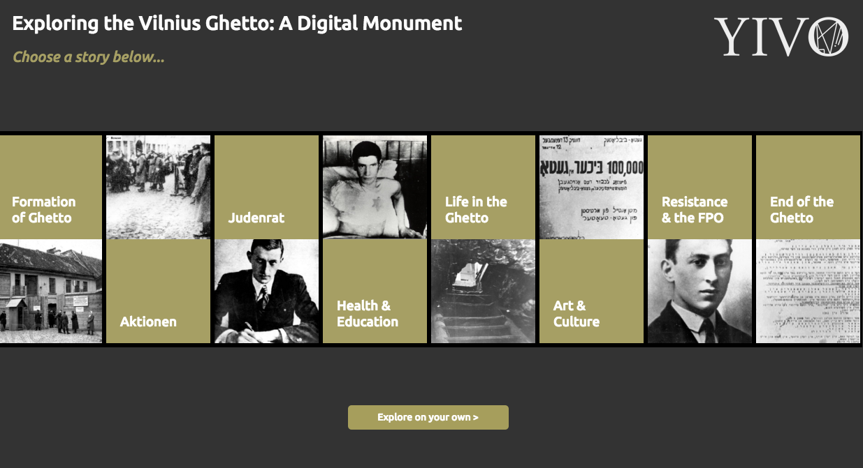 reVILNA aims to narrative, visualize, and map the Jewish Ghetto in the Lithuanian capital of Vilnius. The project explores the events leading up to, during, and after the German occupation of the city. The team uses images, interactive maps, and concise descriptions of aspects of the ghetto, from Art & Culture to Resistance Movements. The information is taken from various memoirs, artifacts, and articles. Therefore, reVILNA tries to describe the historical and cultural landscape of the ghetto from the point of view of those who suffered the injustices.