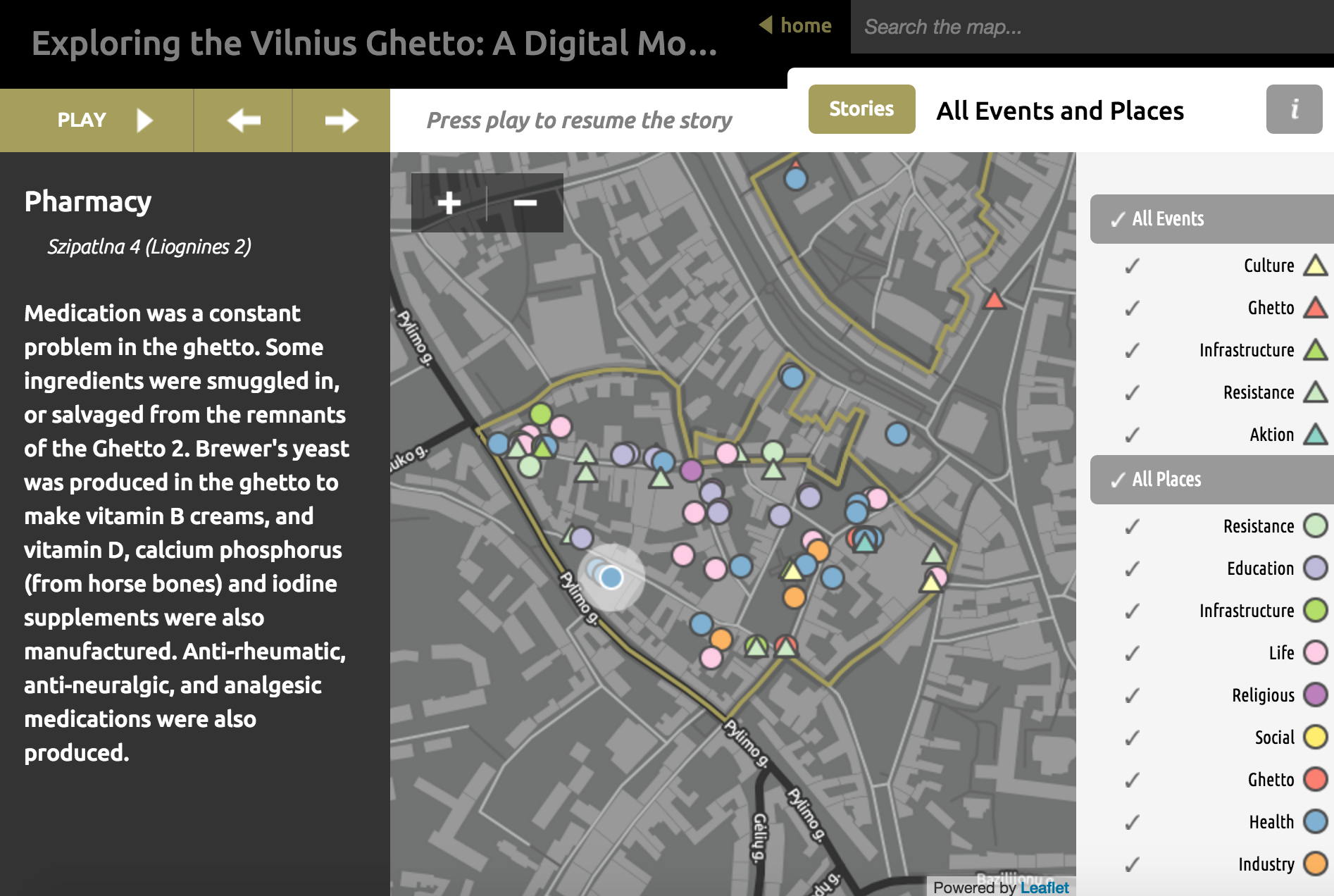 reVILNA is organized by various “stories,” that cover topics like “Formation of the Ghetto” and “Health and Education.” By choosing an option, you are eventually directed to the main map page of the story. Here, you are guided through a tour, ordered by chronology of topic. For more historical sections like “Formation of the Ghetto,” points on the map are linked to specific dates where key events unfolded. For more cultural sections like “Health and Education,” the locations are where important buildings like hospitals and schools were.